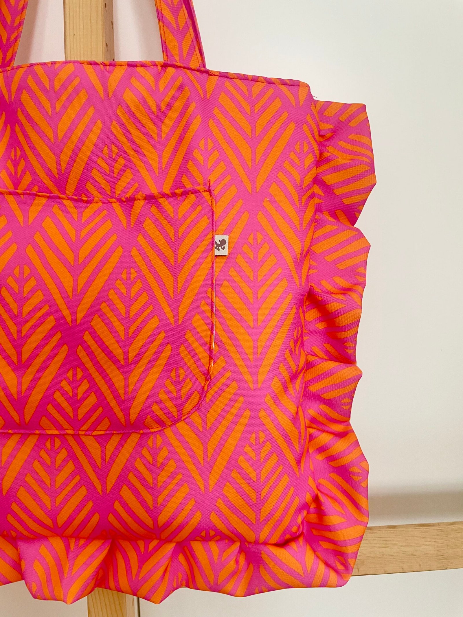 Bolsa de folho em tecido geométrico minimate impermeável, forrada/acolchoada em minimate branco com bolso interior e exterior.